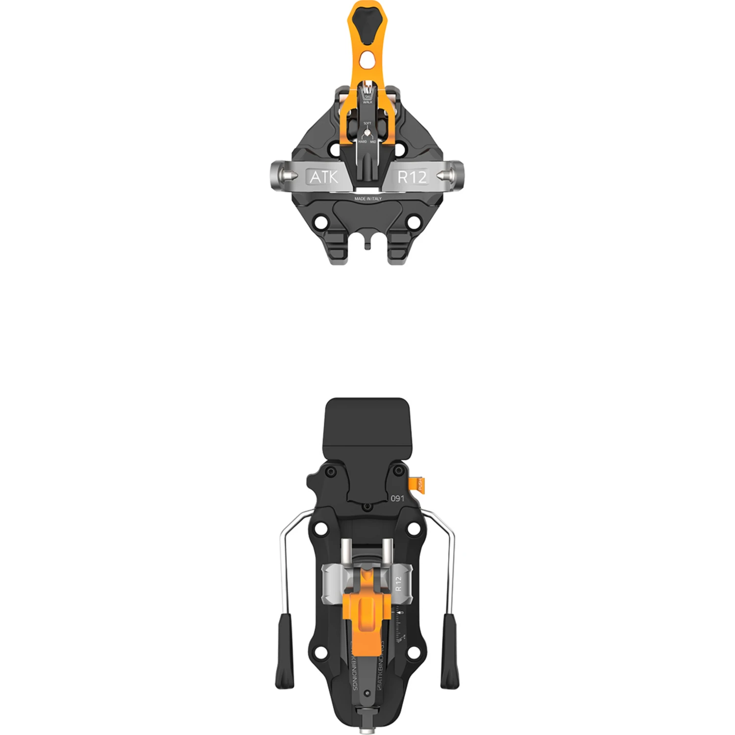 <p>Comfort has a name: ATK Bindings R12 Touring binding. The pin binding has everything to make the ascent easy and the descent safe. And that at just 330 grams including ski stoppers. Light CNC-milled 7075 aircraft aluminium makes this dream a reality.</p><p>One of the comfort highlights is certainly the closed front jaw, which makes it almost impossible for the springs to freeze or for dirt and snow to accumulate, and makes getting in super easy even in soft, deeper snow thanks to the defined shoe tip stop on the open locking lever. The closed construction also offers excellent lateral stability on the descent.</p><p>The R12 comes with integrated crampon holder and magnetic 2-fold climbing aid with no less than five walking positions (flat, +38 mm, +41 mm, +48 mm, +58 mm). Thus the ski can flex freely even on uneven terrain without impairing the function of the binding, a length compensation of up to 4 mm through an integrated damping spring in the base plate ensures the best possible contact pressure at all times. </p><p>The length of the binding can be adjusted by up to 25 mm and thus adapted to shoe soles of different lengths.</p><p>By the way: If stability is not enough, the optional Freeride Spacer AL09 can improve the power transmission in the heel area even further.</p><p>With the new R12 touring binding from ATK Bindings under the feet there are (almost) no more arguments for a framed binding.</p><p>ATK Bindings recommends the R12 touring binding for ski widths of approx. 80-120 mm under the binding and a weight of approx. 1,000-1,700g/ski.</p>